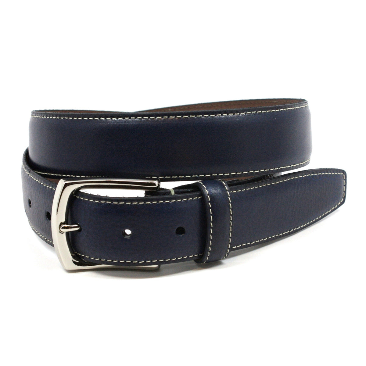 Two-tone Italian Woven Herringbone Stretch Leather Belt - Saddle Brown & Navy Blue