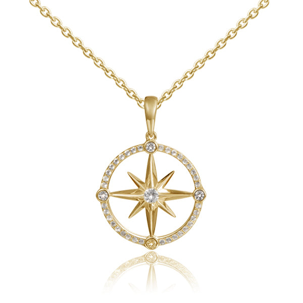 A brilliantly unique pendant, meticulously designed and crafted in the form of a nautical compass rose in gorgeous 14k gold. This exquisite piece features a band of 36 diamonds with aquamarines at the center and four corners. |