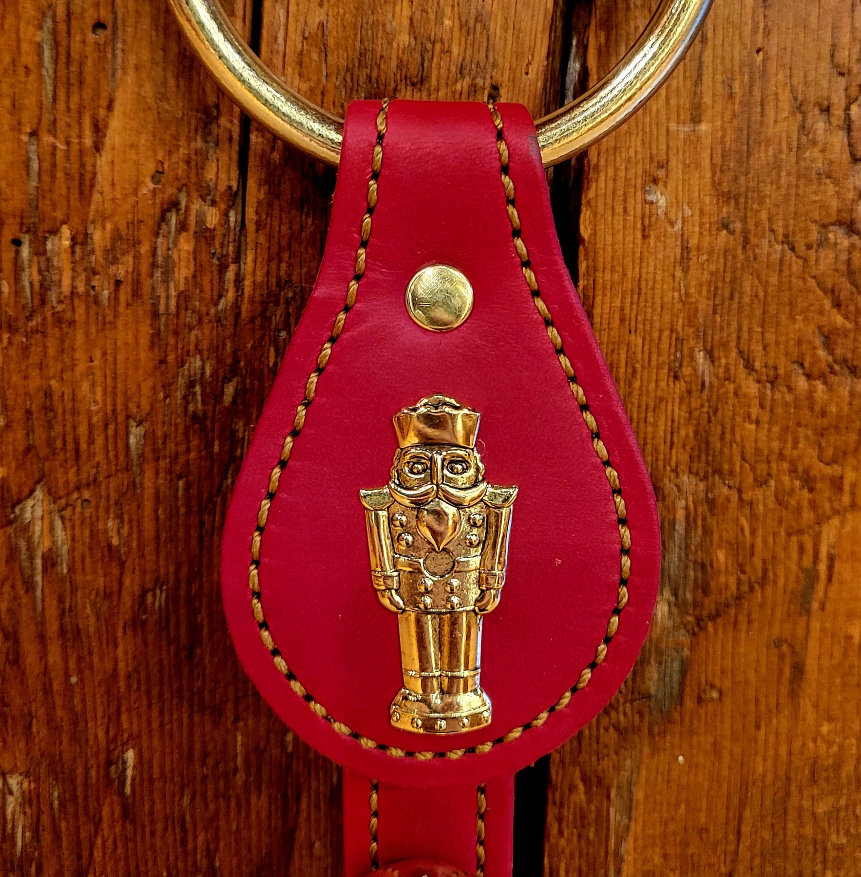Adorned with a Nutcracker ornament and three bells, this decorative leather strap hangs from a solid brass loop sized to fit over most doorknobs.