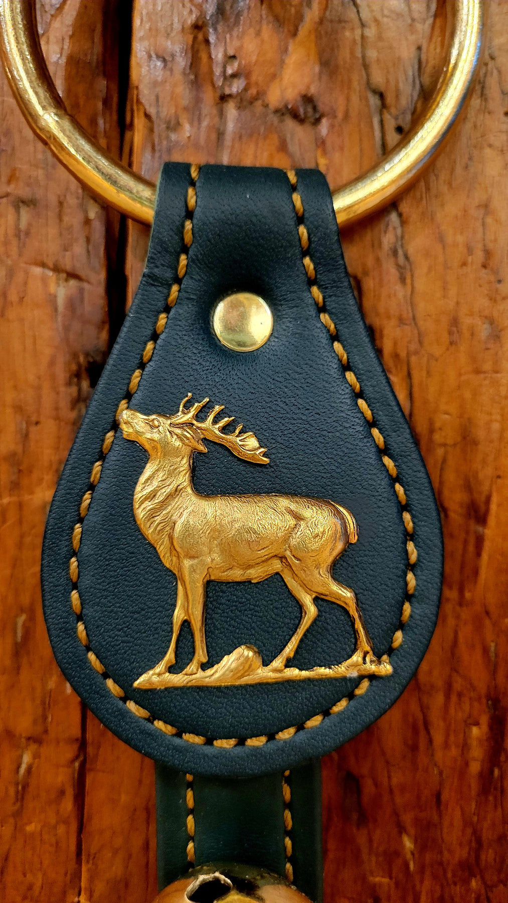 Adorned with an elk stag (or could it be a reindeer?) charm and three brass plated bells, this decorative leather strap hangs from a solid brass loop sized to fit over most doorknobs.
