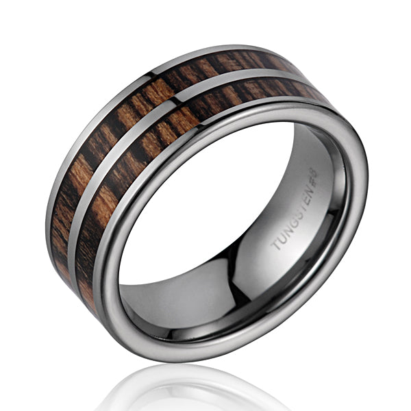 8 millimeter tungsten ring with double inlaid bands of bocote wood.