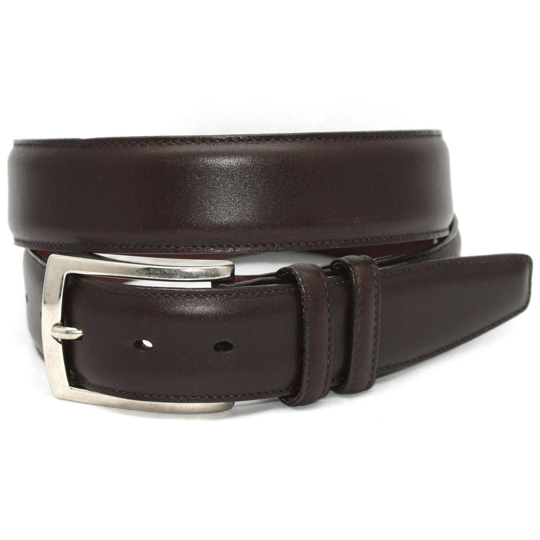 Italian Burnished Calfskin. Full Grain Glove Leather Lined. Padded and Stitched on Edge. Double Loops. Polished Nickel Finished Brass Buckle.