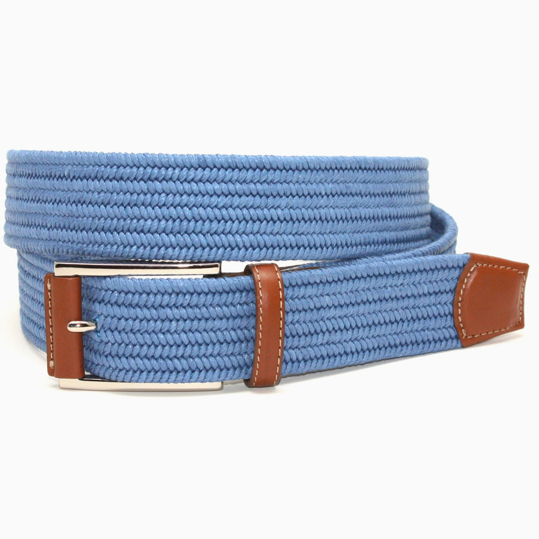 Woven Italian Cotton Stretch. Kipskin Leather Wrapped Buckle & Tab & Loop. Polished Nickel Finished Buckle.