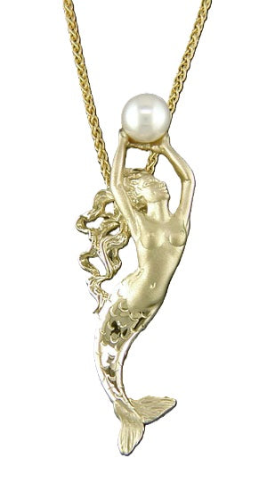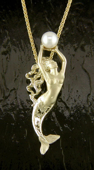 A gorgeous design of a mermaid playfully holding a pearl, gloss and matte finishes to the gold highlight the flowing movement of the piece.